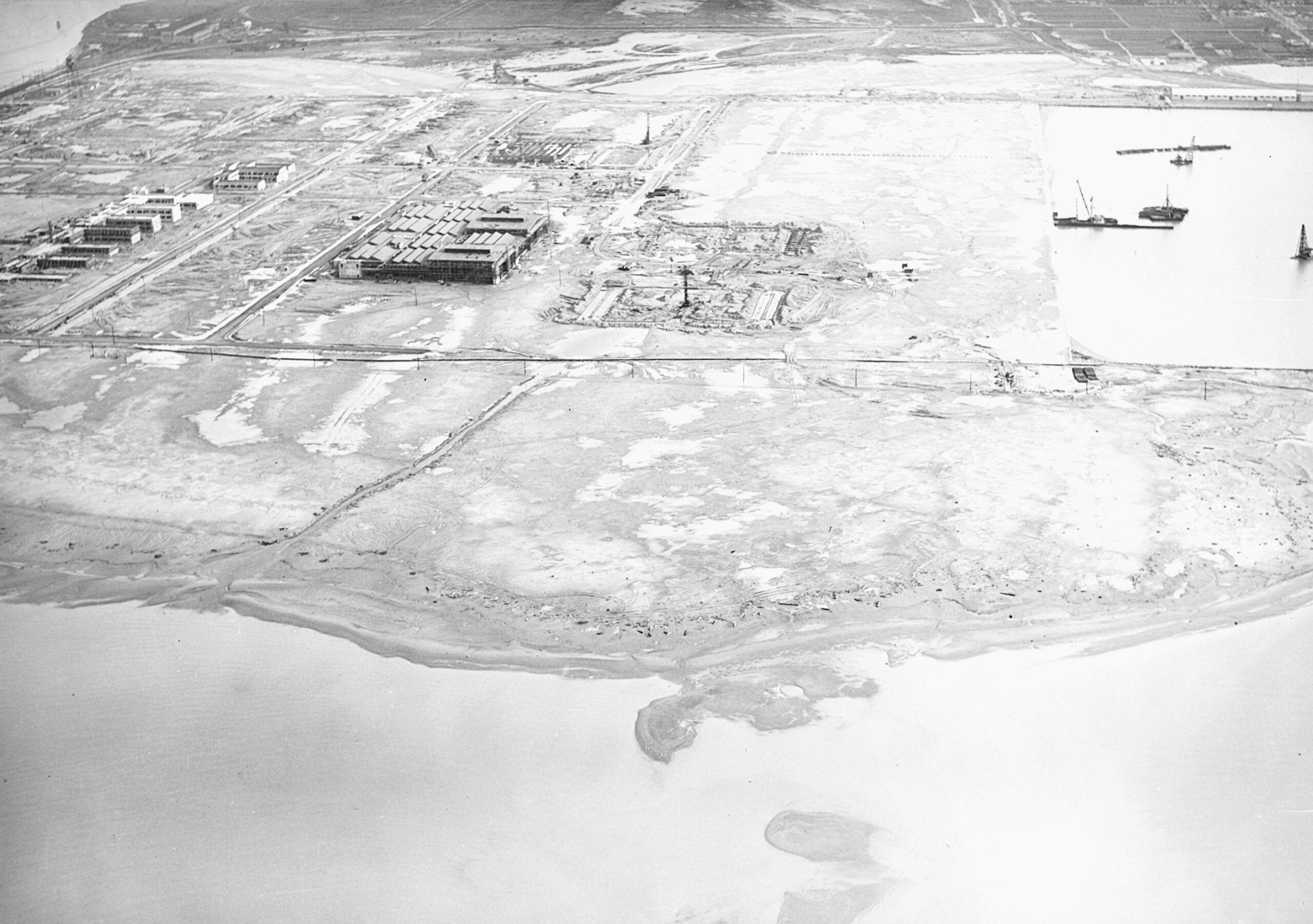 On March 15, 1938, nearly two years before the time limit set, work on the Naval Air Station on Alameda’s tidelands was officially started. Commander E.C. Seibert of the Navy’s Bureau of Yards and Docks took charge of contract construction work, and Captain Walter R. Allen, public works officer for the Twelfth Naval District, was placed in charge of construction details of the $15,000,000 project.